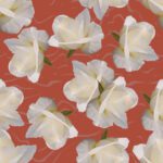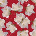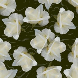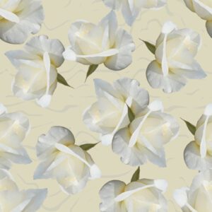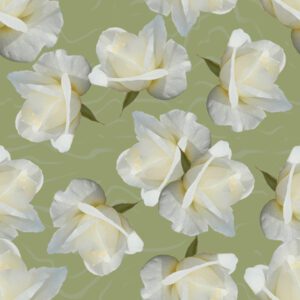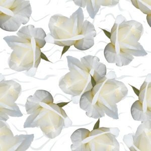 I created two fabric and wallpaper designs featuring white roses. The first features the flowers and buds from Darlow’s Enigma, a thornless bush rose with tiny flowers, and the second features the half-opened buds of a creamy white tea rose. I’ve also created some coordinating fabric designs. On Raspberry Creek Fabrics, look for sets divided into warm and cool colors, and by fabric or wallpaper.